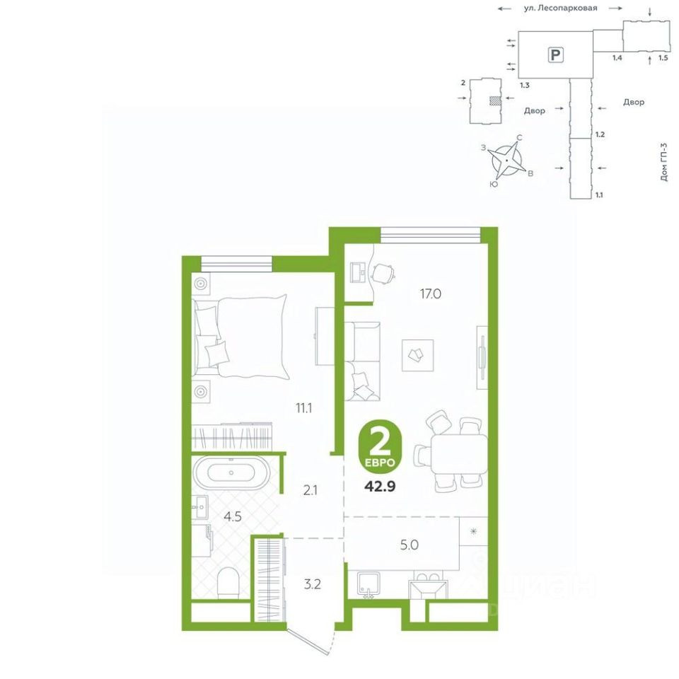 Квартира располагается в ГК ''Чистые Пруды'' от ''Паритет девелопмент''. Это флагманский проект компании в Тюмени. Расположение вдали от шумных улиц и оживленного центра создает ощущение жизни на природе и окружает тишиной и спокойствием. Есть вся необходимая социальная и коммерческая инфраструктура: магазины и сфера услуг на первых этажах. Школы, сады, поликлиника, парки в шаговой доступности. Квартал строится в районе Новой Лесобазы. Рядом выезд на объездную, что существенно экономит время. Поездка до центра города на автомобиле занимает 15-20 минут. Городские кварталы ''Чистые Пруды''сформирован из домов переменной этажности и многоуровневых паркингов. Ввод 1 очереди строительства запланирован на II кв. 2028 года. Всё благоустройство квартала представлено двумя функциональными зонами: приватная внутри дворовая и общественная. Каждый закрытый двор имеет выход на единую променадную зону - бульвар. Концепция благоустройства основана на принципе модульности, что формирует основную идею приватности. Приватность проекта подчеркивает его особенный климат внутри. Модульное благоустройство позволит максимально эффективно использовать пространство двора и удовлетворить потребности различных категорий жителей. В квартирах базово выполнена улучшенная черновая отделка, которая включает в себя: выровненные стены, стяжка пола с шумоизоляцией, горизонтальная разводка отопления, установлены счетчики с телеметрией, окна с 5-камерным профилем и надежные входные двери. При желании можно добавить ремонт от застройщика и включить его в стоимость ипотеки, что позволит сэкономить на стройматериалах и переехать сразу после получения ключей. Характеристики квартиры: этаж - 7 количество комнат - 2 номер помещения - 57 площадь квартиры - 42,9 кв.м Гармоничные пропорции и большие окна наполняют пространство светом, создавая уютную атмосферу. Умное зонирование позволяет удобно организовать как рабочую, так и жилую зоны, что особенно важно для современных жителей. Санузел спроектирован с учетом всех потребностей: здесь есть ванна и место для стиральной машины. Каждый метр квартиры используется с максимальной эффективностью, что делает эту планировку отличным выбором для тех, кто ценит комфорт и удобство.