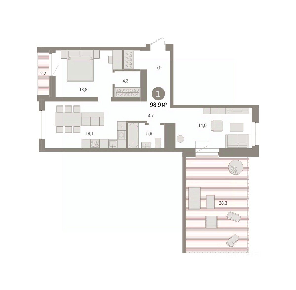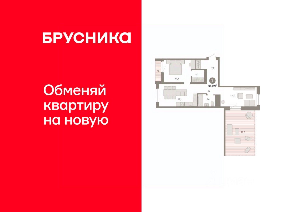 Квартира с кухней-гостиной и одной спальней в жилом районе ''Речной порт''. Особенности планировки: окна на две стороны, свободная планировка, терраса на крыше. квартиры в нашей базе: РПТ04-Ж7.10.1.