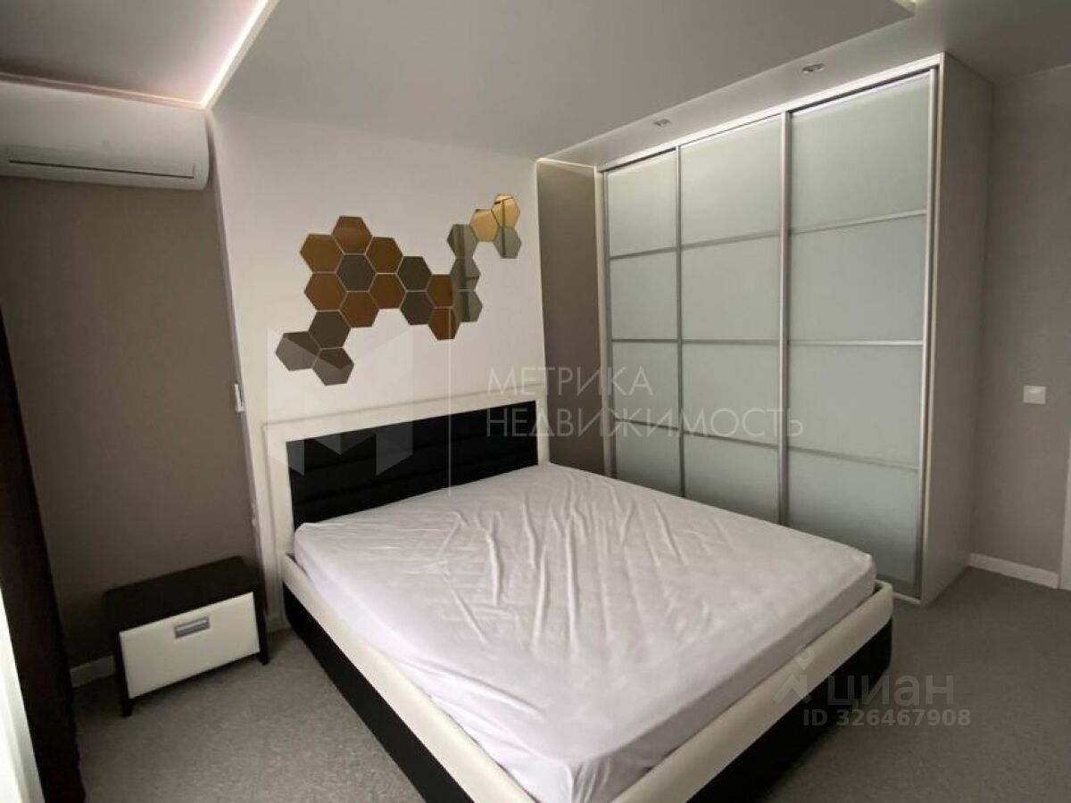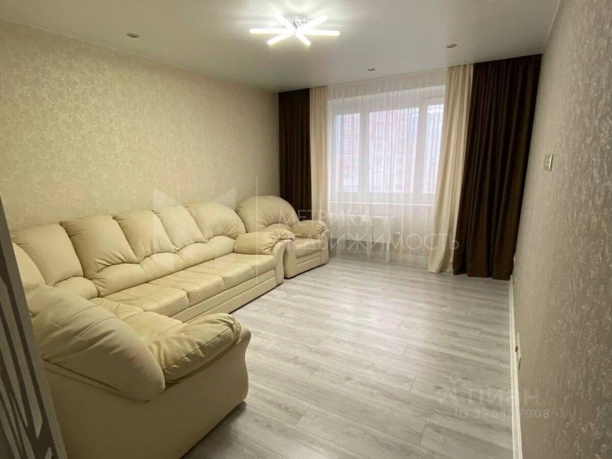 В гостиной расположен кожаный раскладной диван, кожаное кресло, тюль и плотные шторы. В спальной комнате двуспальная кровать с матрацем и наматрасником, прикроватная тумбочка, удобный и вместительный встроенный трехдверный шкаф, на окнах рулонные шторы (блекаут, т.к.