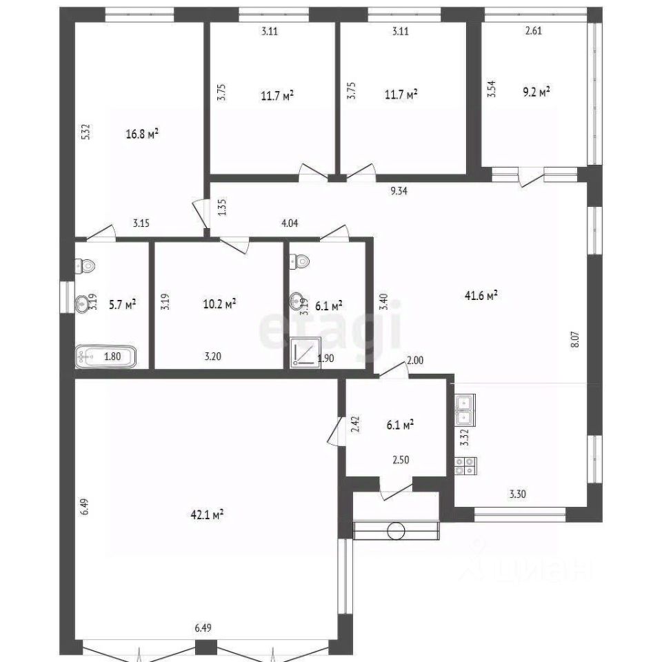 Комнаты: 11.7 м2 и 10.2 м2 Мастер - спальня: 16.8 м2 Кухня гостиная: 41.6 м2 Гараж 42. 1