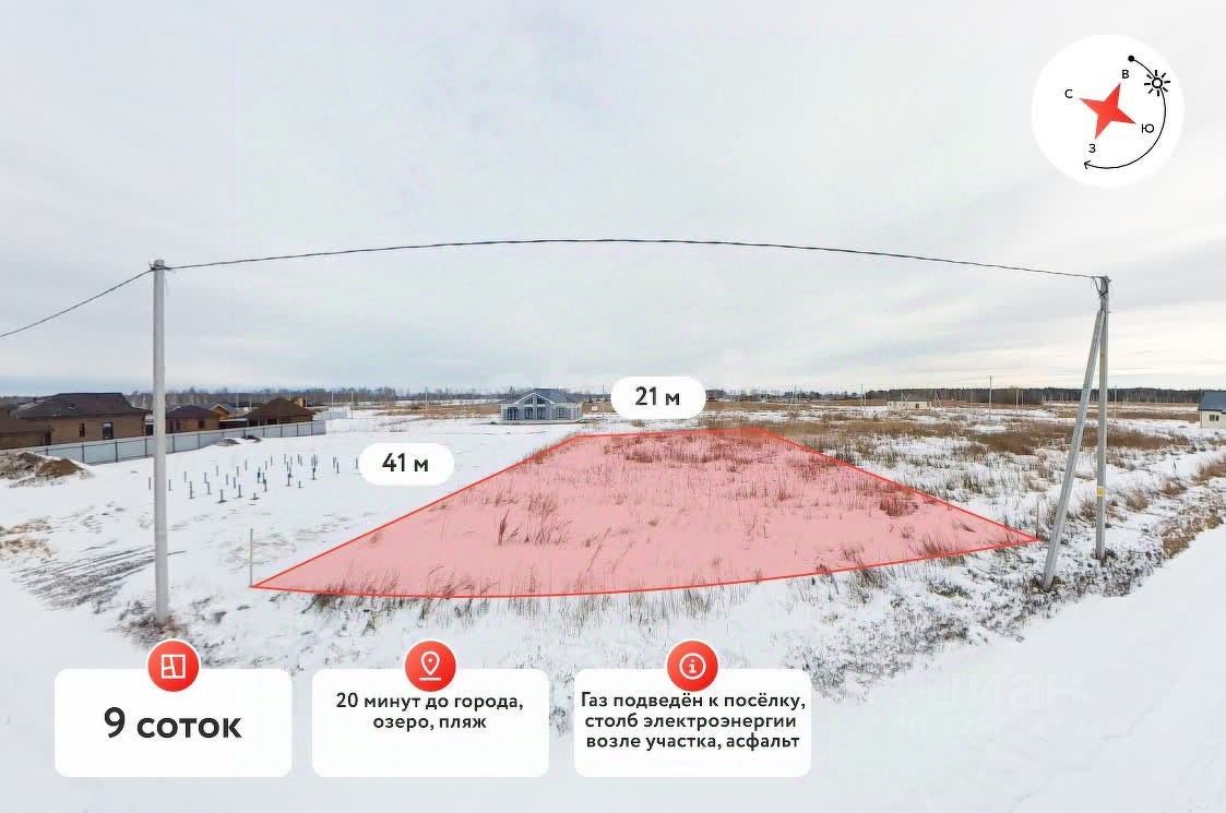 Продаётся ровный земельный участок по доступной цене, расположенный в 20 минутах езды от Тюмени по Московскому тракту в коттеджном поселке ''Малиновка''. В коттеджном поселке есть озеро, от участка всего 330 метров до пляжа. Предназначен для индивидуального жилищного строительства, находится в экологически чистом месте, земли ИЖС. Газ подведён к посёлку, электроснабжение - столб возле участка. Подъезд к участку с федеральной трассы ЕкатеринбургТюмень. В 5 минутах от посёлка находится село Успенка с развитой инфраструктурой.