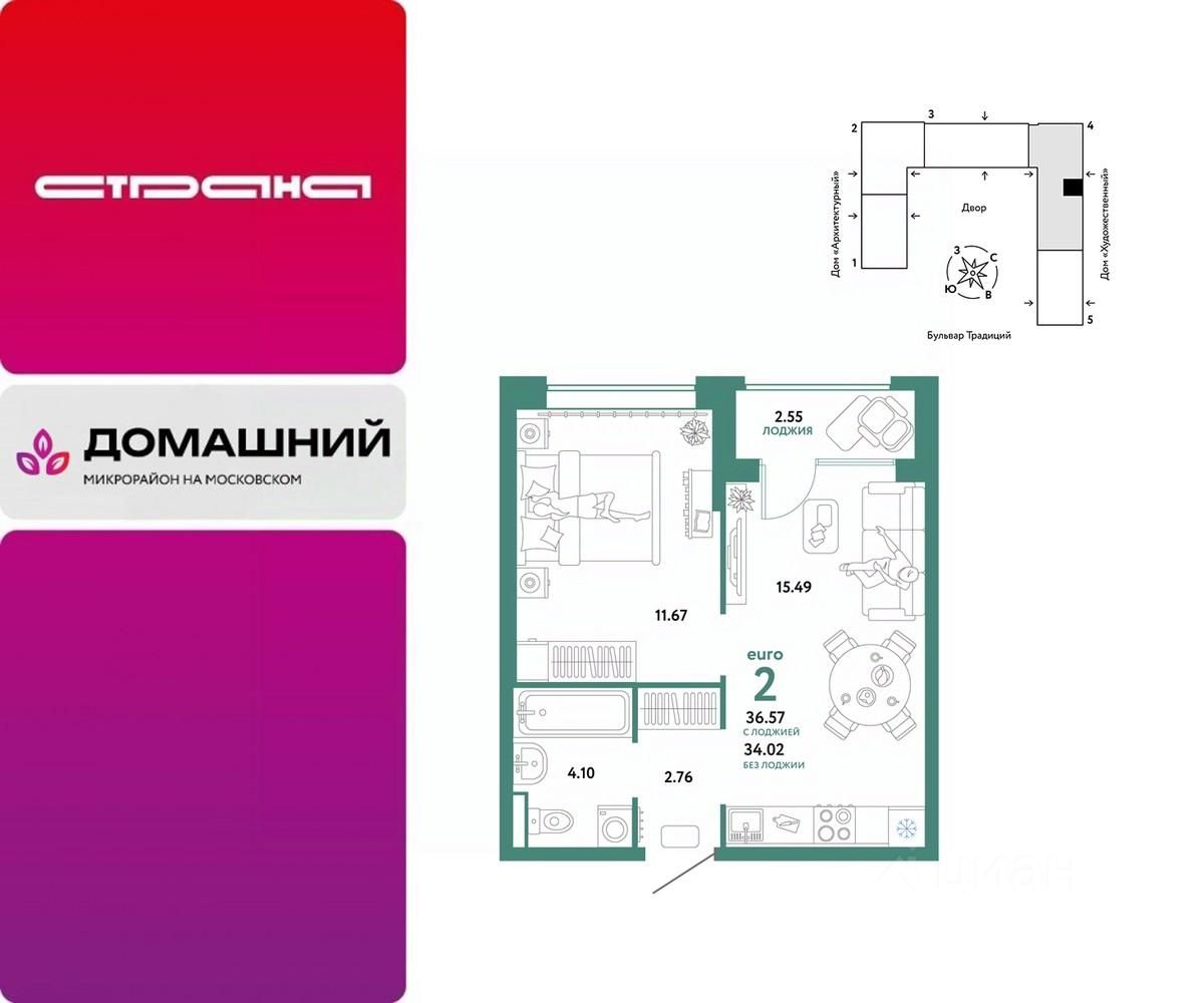 Продается 2комнатная квартира на 9 этаже от застройщика Страна Девелопмент. Площадь квартиры 36,57 кв. м.