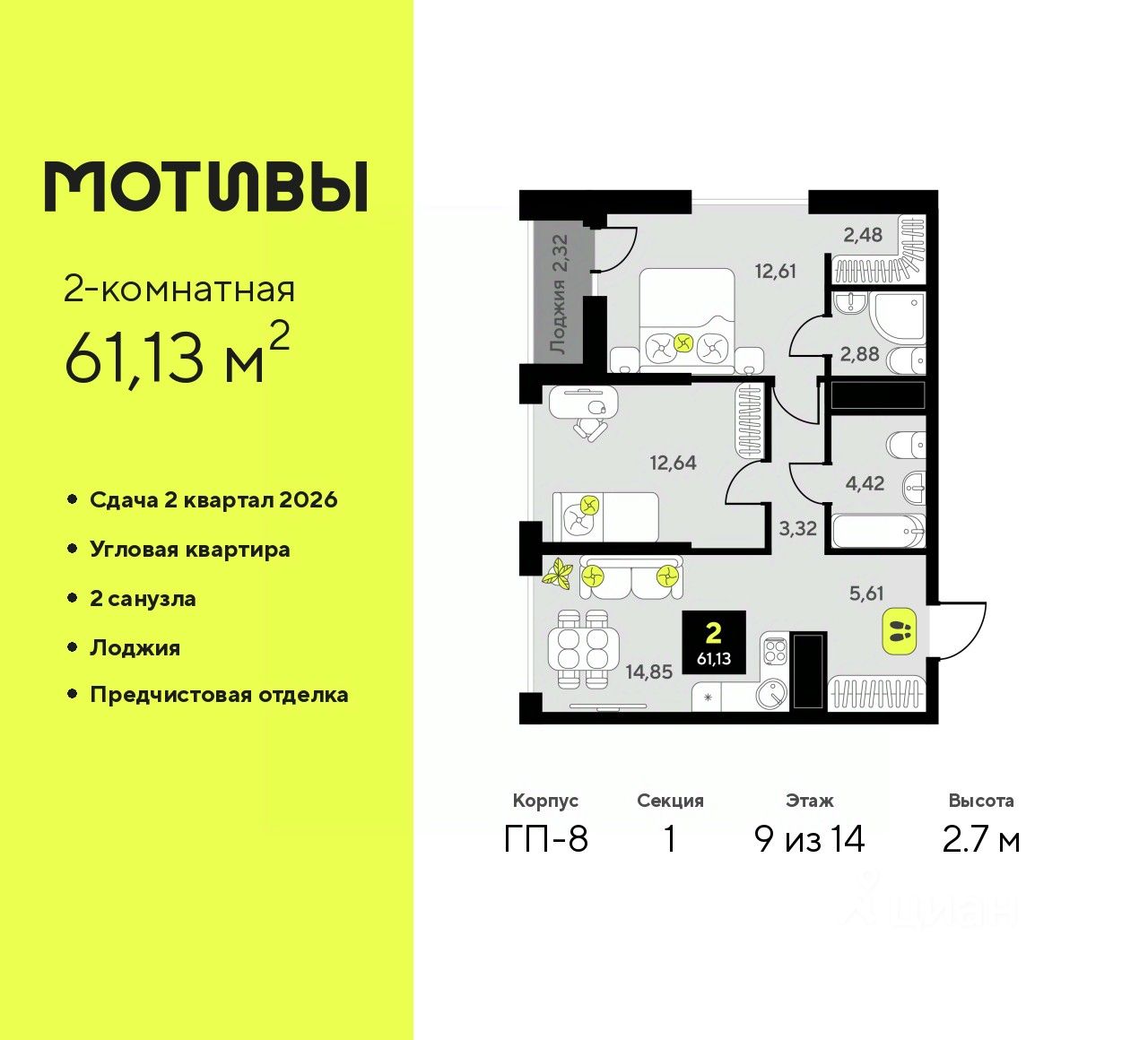 2-комн. квартира с предчистовой отделкой в ЖК ''Мотивы'' на 9 этаже. Общая площадь: 61.13 кв.м., жилая: 25.25 кв.м., площадь просторной кухни-столовой: 14.85 кв.м. Угловая квартира, идеально подойдет любителям тишины и панорамных видов. В квартире одна лоджия, два совмещенных санузла. Высота потолков 2.7 м.
