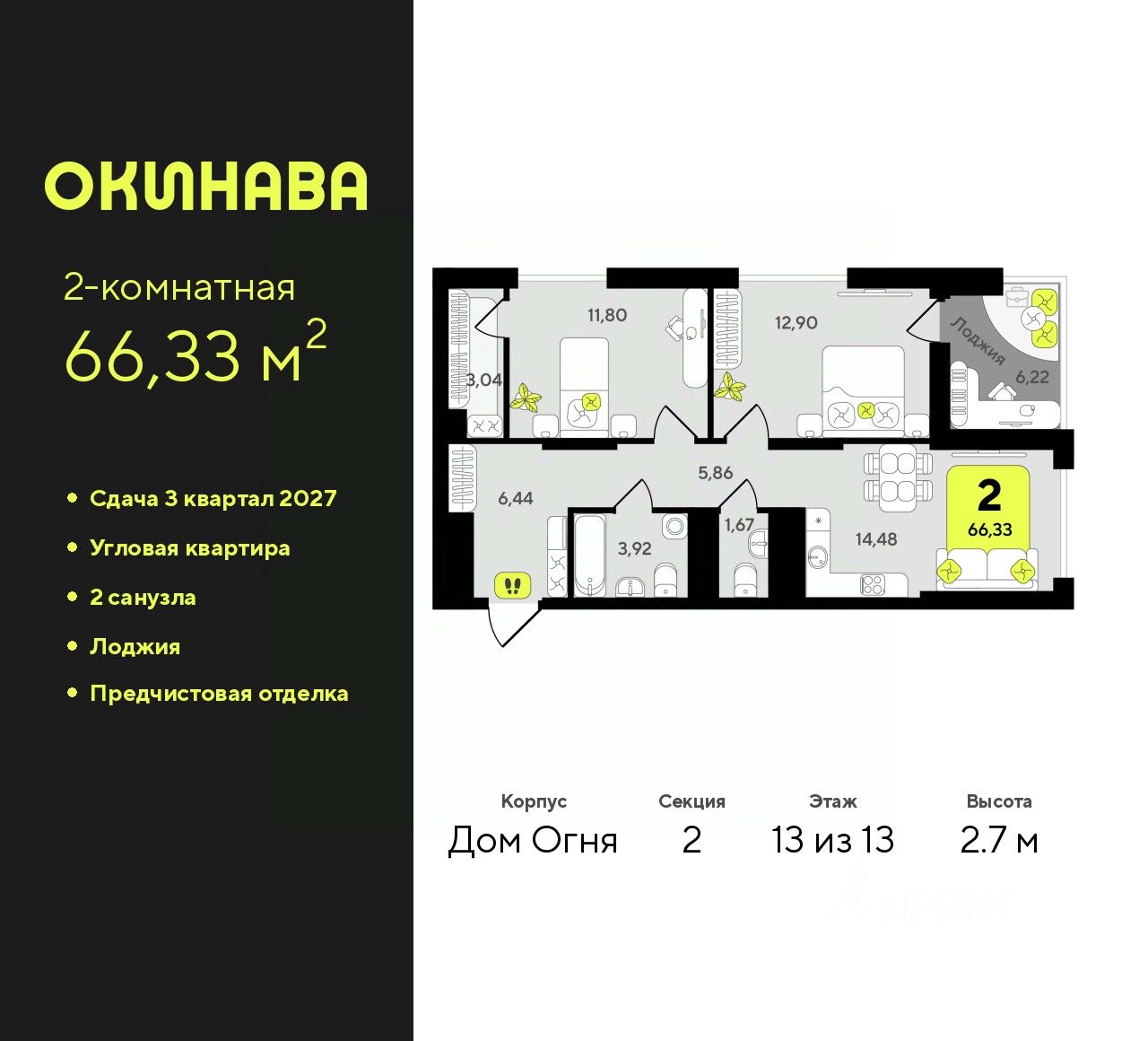 Двухкомнатная квартира с предчистовой отделкой в ЖК ''Окинава'' на 13 этаже. Общая площадь: 66.33 кв.м., жилая: 24.7 кв.м., площадь просторной кухни-столовой: 14.48 кв.м. Квартира угловая, очень светлая, естественная вентиляция при открытии окон. В квартире одна лоджия, один совмещенный и один раздельный санузел. Высота потолков 2.7 м.