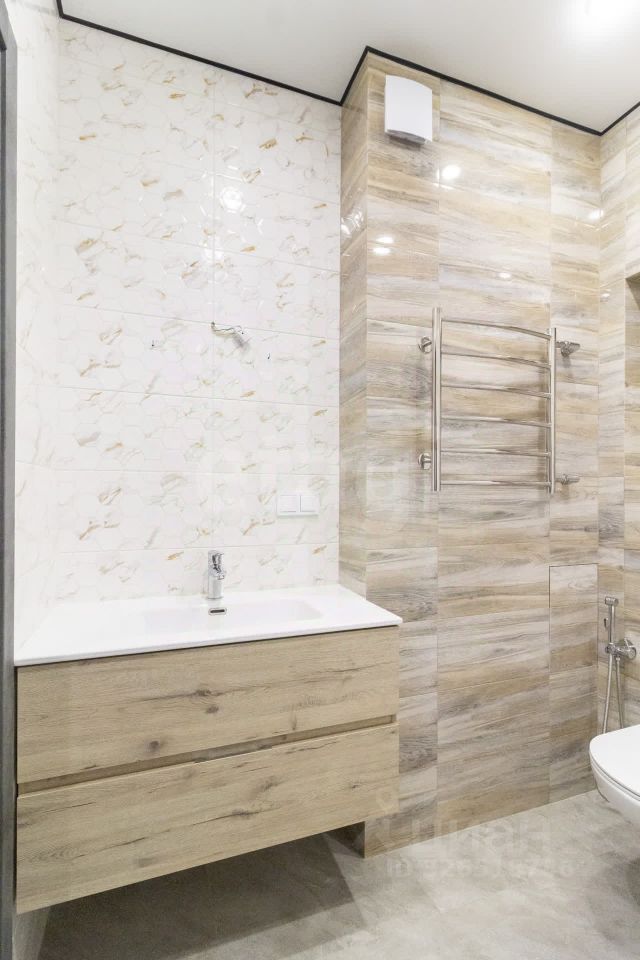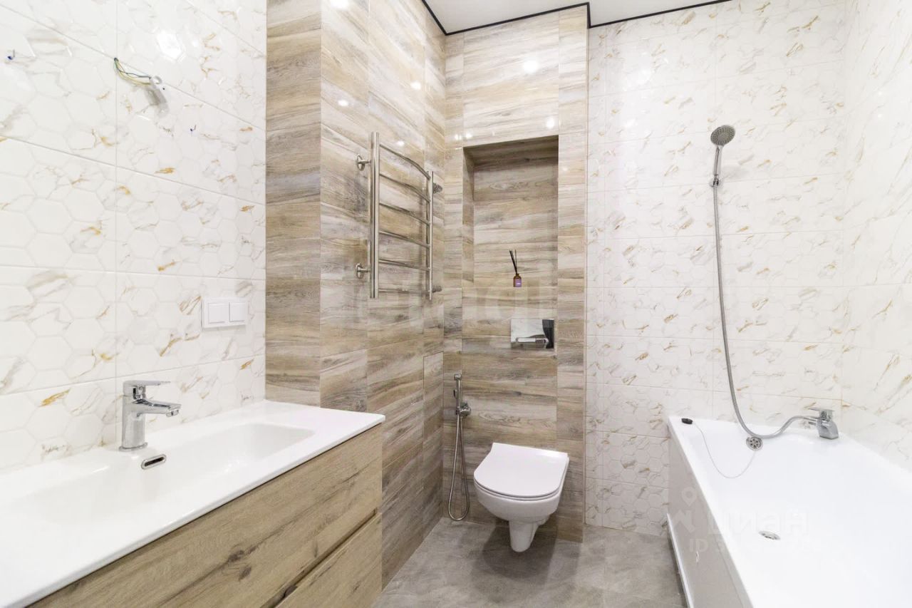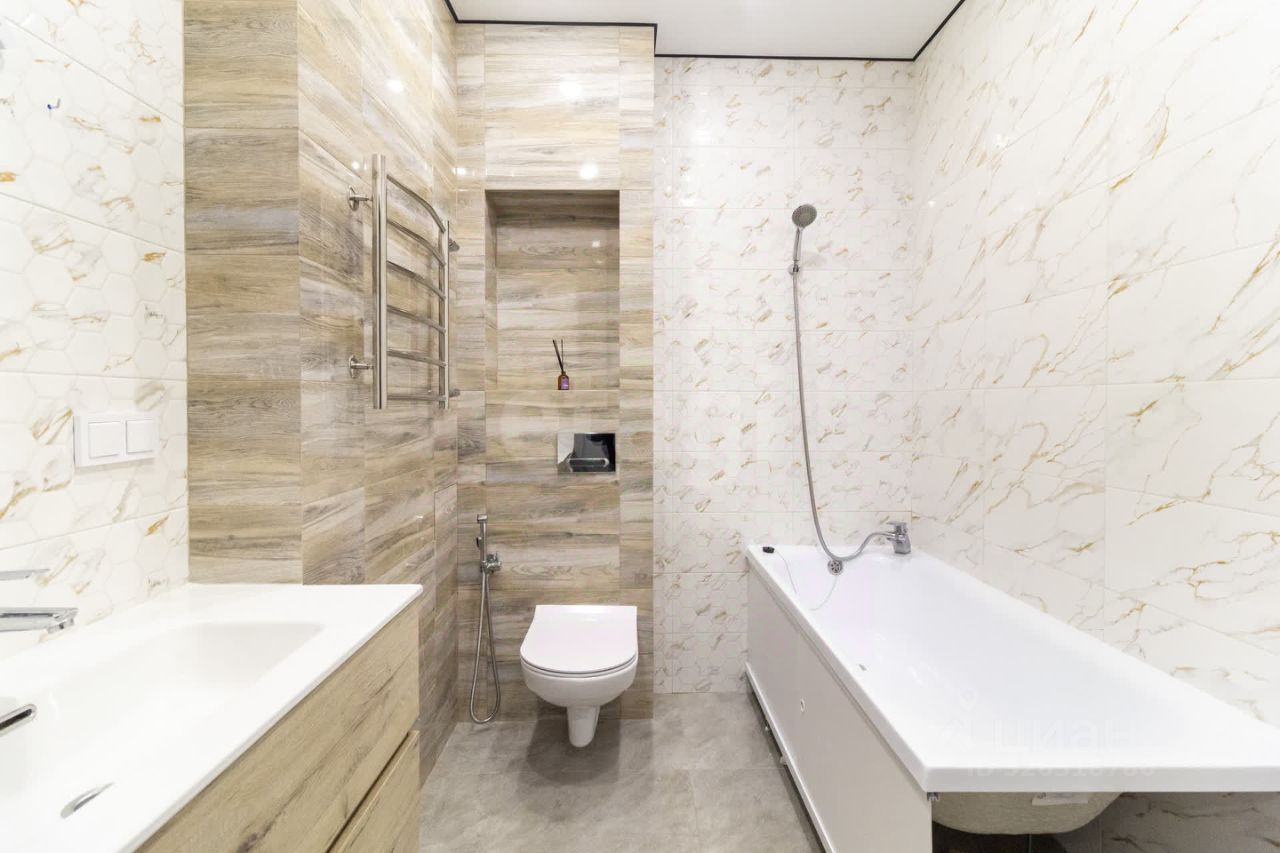 - Пол выложен плиткой керамогранит. - Слева находится встроенный шкаф-купе. - Справа расположен просторный санузел с установленной инсталляцией, гигиеническим душем, новой ванной и навесной тумбой с умывальником.