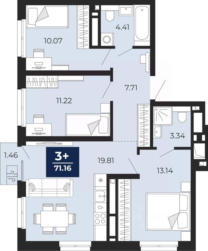 Трехкомнатная квартира с предчистовой отделкой в ЖК ''Беринг'' на 21 этаже. Общая площадь: 70.14 кв.м., жилая: 34.43 кв.м., площадь просторной кухни-столовой: 19.81 кв.м. Квартира угловая, окна oбecпeчивaют paвнoмepнoe ocвeщeниe в тeчeниe дня. В квартире один балкон, два совмещенных санузла. Высота потолков 2.72 м.