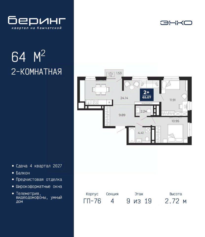 Двухкомнатная квартира от застройщика с предчистовой отделкой в ЖК ''Беринг'' на 9 этаже. Общая площадь: 64 кв.м., жилая: 22.86 кв.м., площадь просторной кухни-столовой: 24.14 кв.м. Угловая квартира, окна oбecпeчивaют paвнoмepнoe ocвeщeниe в тeчeниe дня. В квартире один балкон, один совмещенный и один раздельный санузел. Высота потолков 2.72 м.