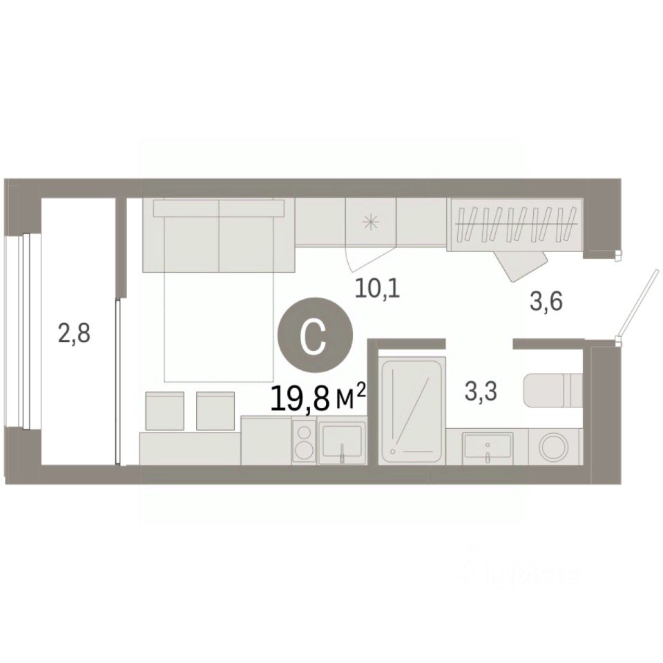 Продается 1-комн. студия с предчистовой отделкой в ЖК ''Республики 205'' на 5 этаже. Общая площадь: 19.82 кв.м., площадь гостиной 10.1 кв.м., из которых 5 кв.м. выделено под кухонную зону. Все окна выходят на одну сторону. В квартире один балкон, один совмещенный санузел. Высота потолков 2.6 м.