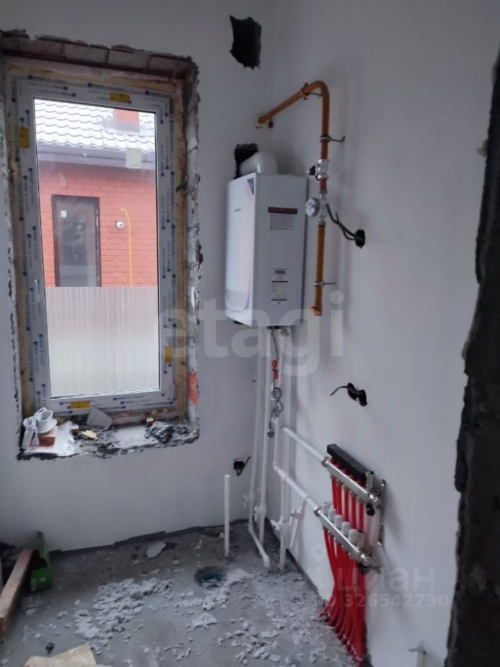 Дом построен из керамзитобетонных блоков с утеплением и облицовкой кирпичом, что обеспечивает высокую энергоэффективность. Крыша из металлочерепицы, фундамент — ленточный на буроналивных сваях. Установлены пластиковые окна с тройным стеклопакетом. Объект продается с улучшенной черновой отделкой: стяжка пола, оштукатуренные стены под обои, разведенное электричество. Система отопления комбинированная — газовый двухконтурный котел питает радиаторы и водяной теплый пол на первом этаже. Водоснабжение от скважины, канализация — септик закрытого типа на 8 куб. м.