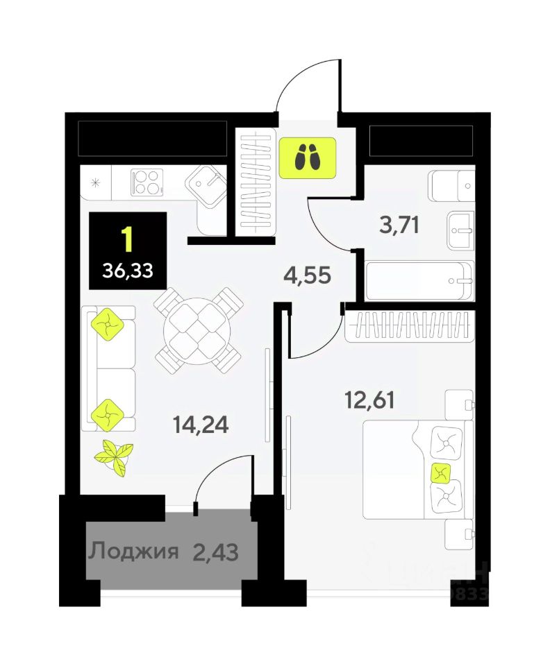 Просторная 1-комн. квартира в ЖК ''Мотивы'' на 8 этаже. Общая площадь: 34.1 кв.м. Высота потолков 2.7 м.