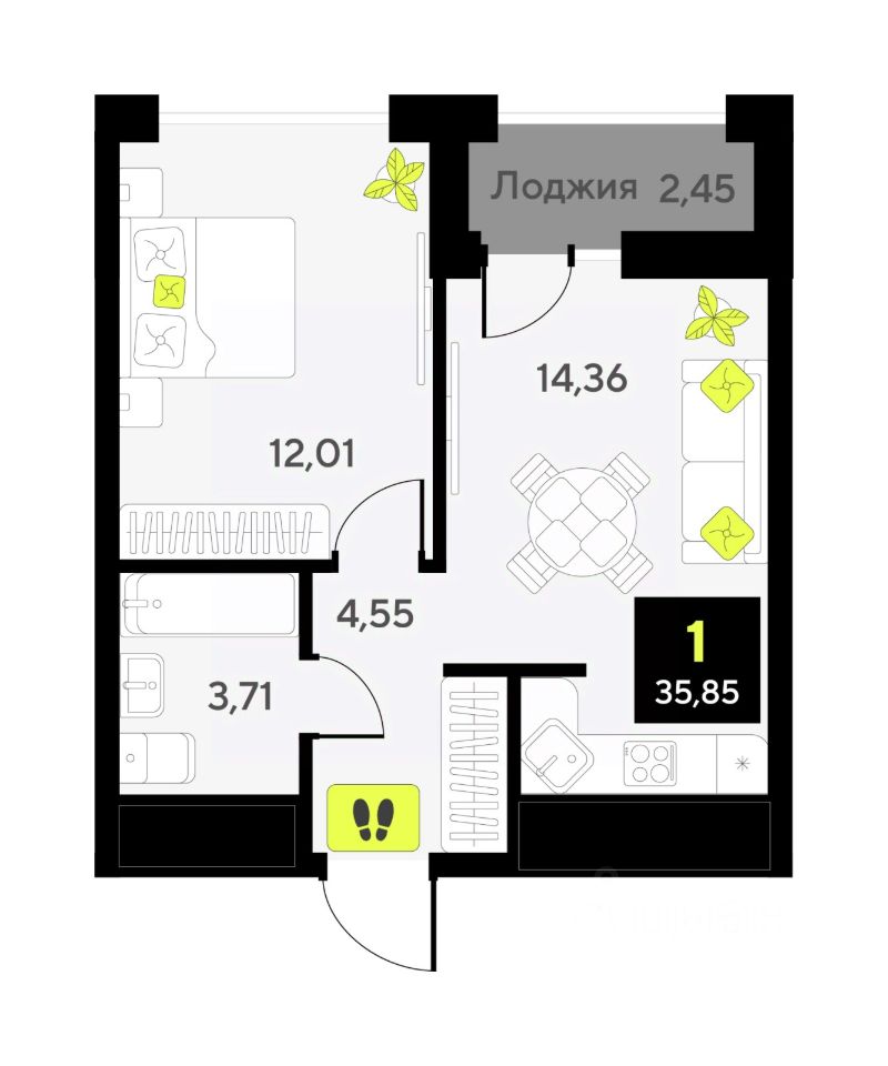 Однокомнатная квартира в ЖК ''Мотивы'' на 14 этаже. Общая площадь: 33.9 кв.м. Высота потолков 2.7 м.