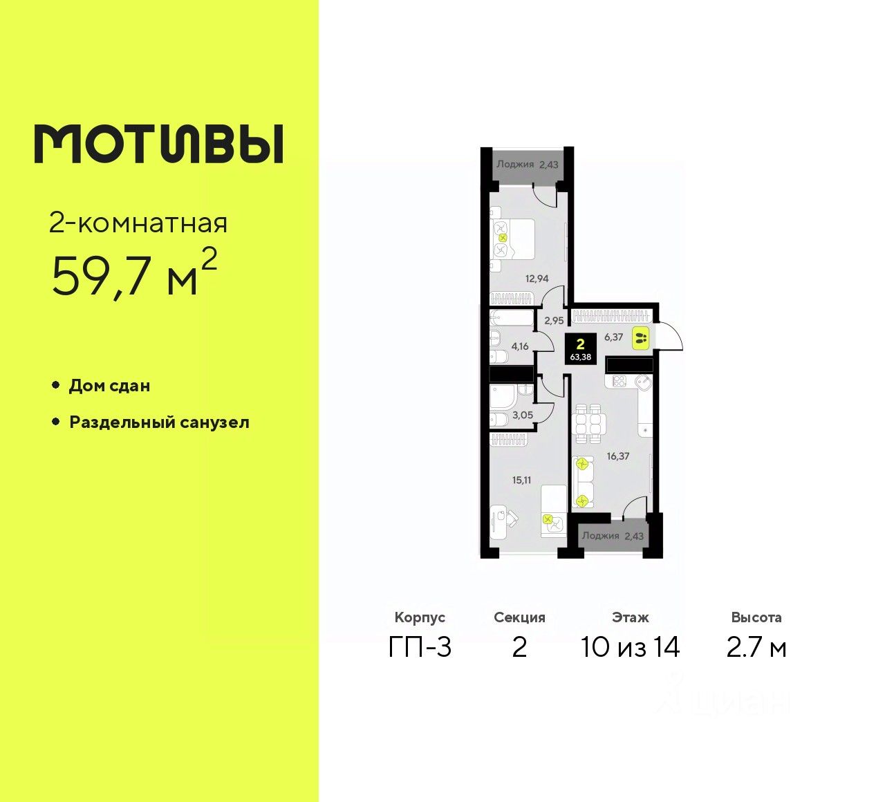 Просторная 2-комн. квартира в ЖК ''Мотивы'' на 10 этаже. Общая площадь: 59.7 кв.м. Высота потолков 2.7 м.