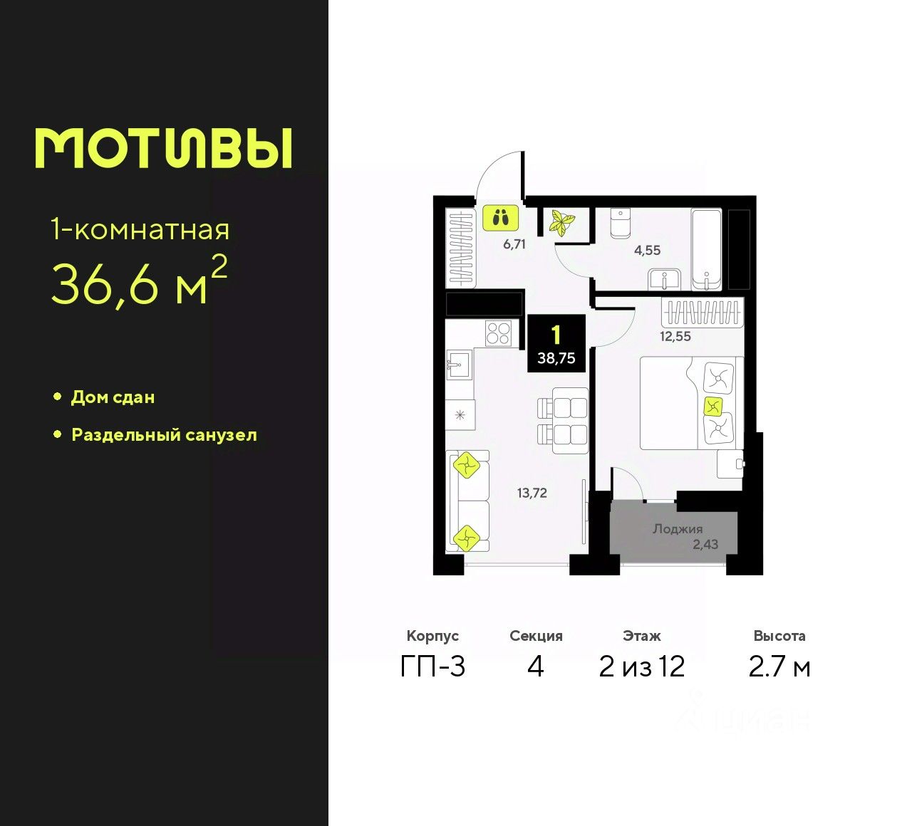 Общая площадь36,6 м2