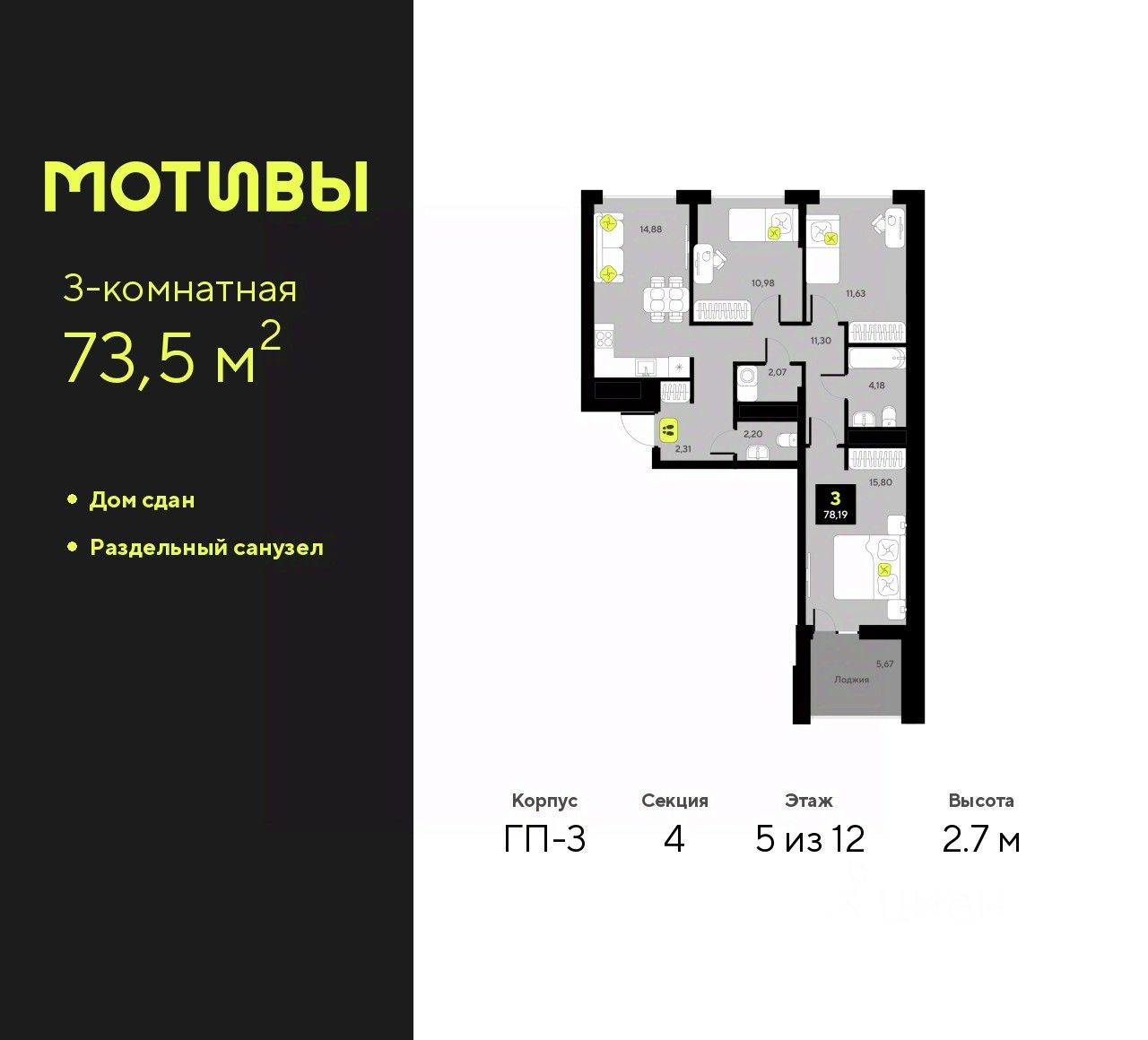 Продается 3-комн. квартира от застройщика в ЖК ''Мотивы'' на 5 этаже. Общая площадь: 73.5 кв.м. Высота потолков 2.7 м.