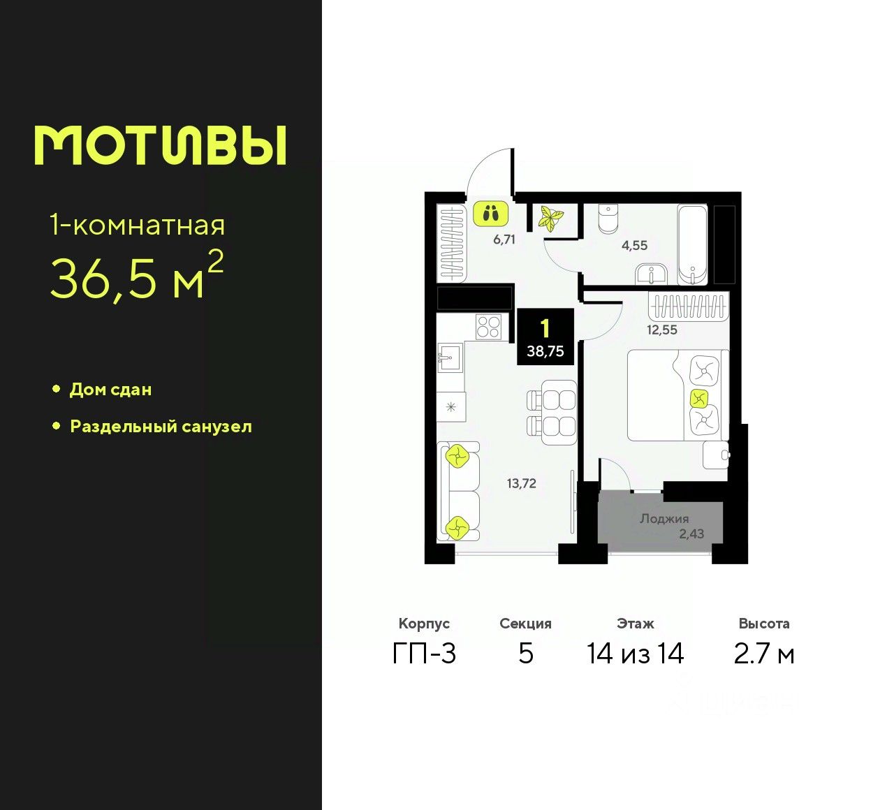 Просторная 1-комн. квартира в ЖК ''Мотивы'' на 14 этаже. Общая площадь: 36.5 кв.м. Высота потолков 2.7 м.