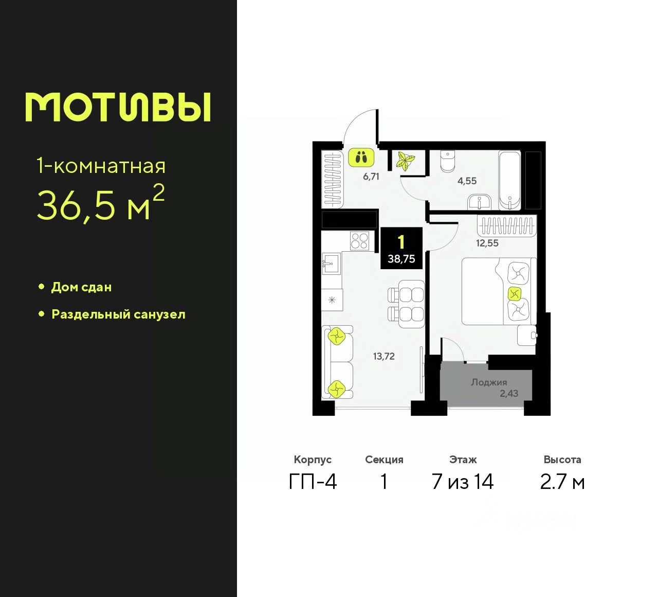 Продается однокомнатная квартира от застройщика в ЖК ''Мотивы'' на 7 этаже. Общая площадь: 36.5 кв.м. Высота потолков 2.7 м.