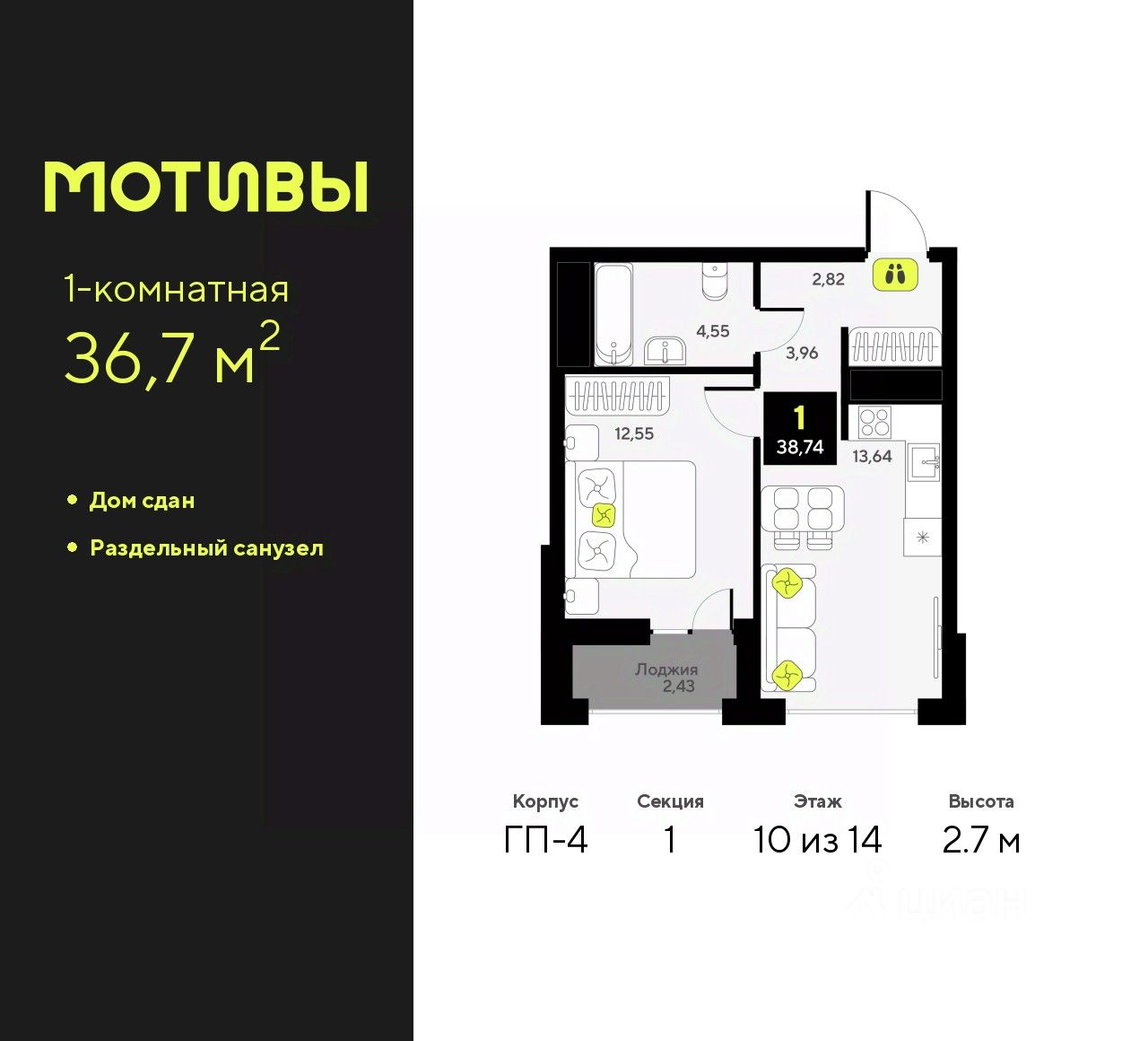 1-комн. квартира в ЖК ''Мотивы'' на 10 этаже. Общая площадь: 36.7 кв.м. Высота потолков 2.7 м.