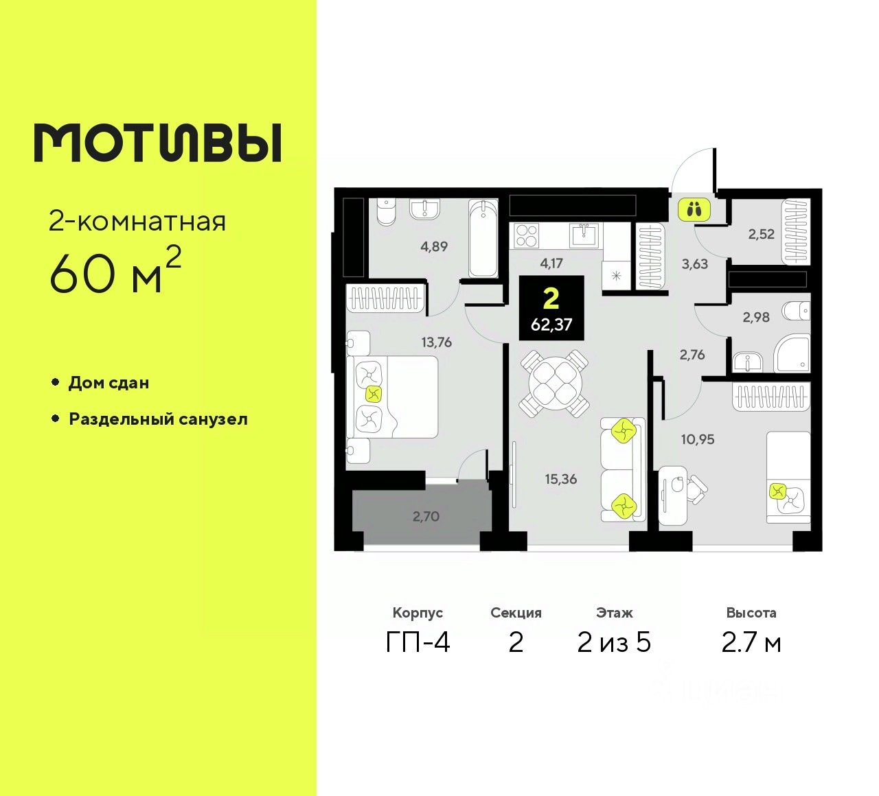2-комн. квартира в ЖК ''Мотивы'' на 2 этаже. Общая площадь: 60 кв.м. Высота потолков 2.7 м.