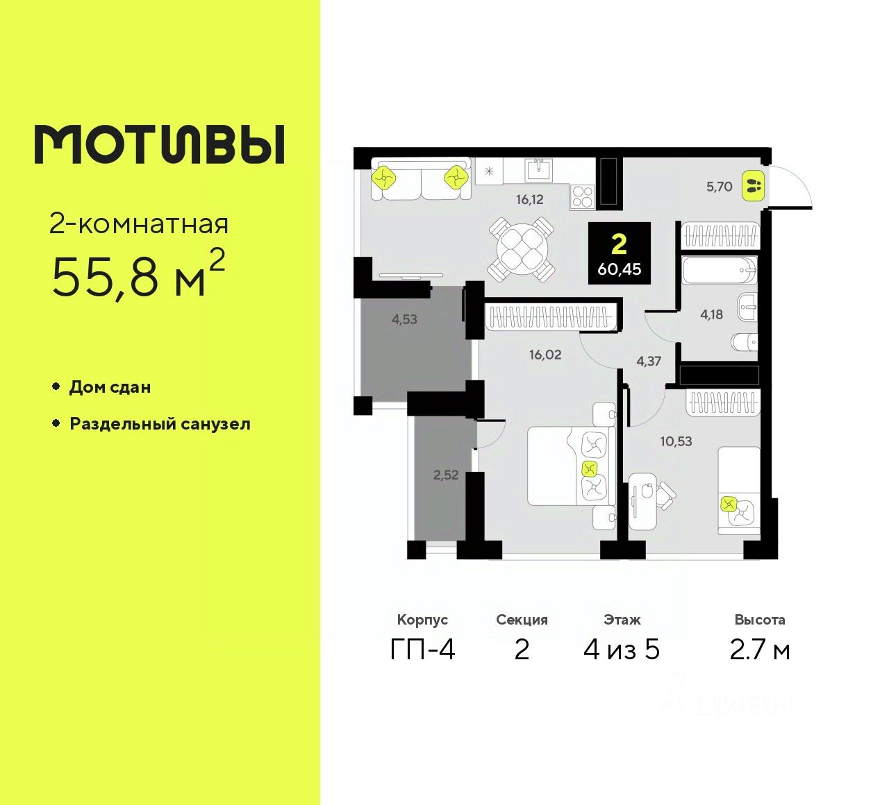 Двухкомнатная квартира от застройщика в ЖК ''Мотивы'' на 4 этаже. Общая площадь: 55.8 кв.м. Высота потолков 2.7 м.