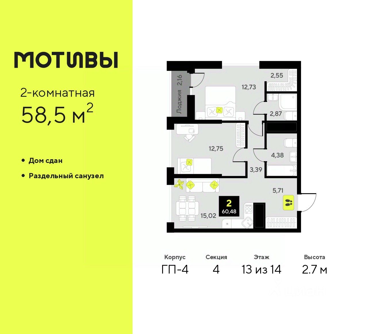 Продается 2-комн. квартира в ЖК ''Мотивы'' на 13 этаже. Общая площадь: 58.5 кв.м. Высота потолков 2.7 м.