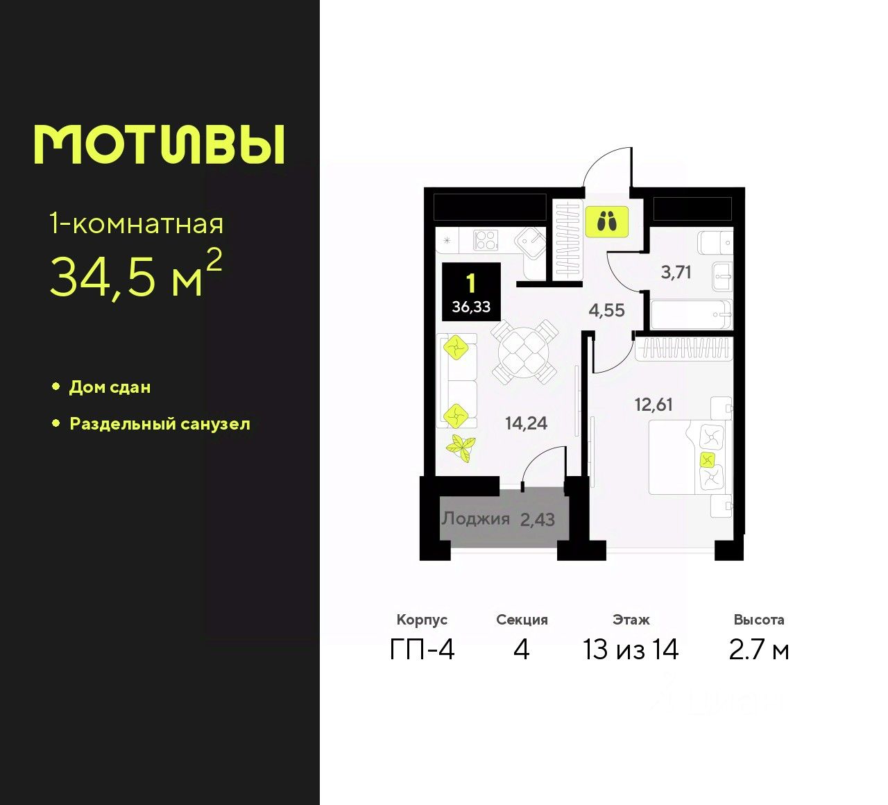 Однокомнатная квартира в ЖК ''Мотивы'' на 13 этаже. Общая площадь: 34.5 кв.м. Высота потолков 2.7 м.