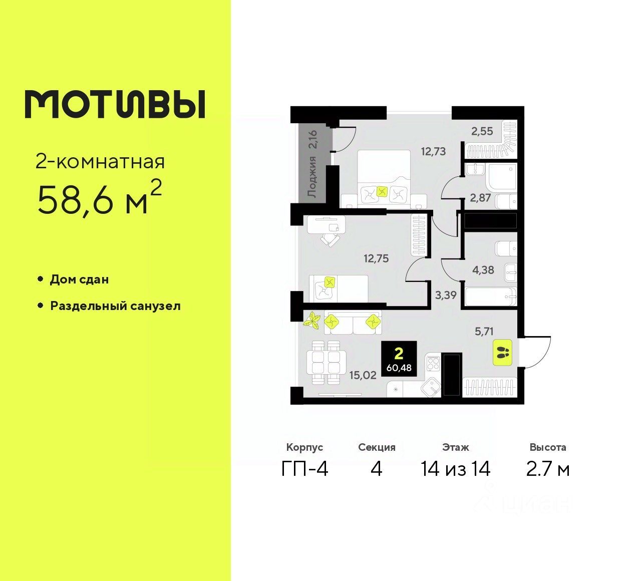 2-комн. квартира от застройщика в ЖК ''Мотивы'' на 14 этаже. Общая площадь: 58.6 кв.м. Высота потолков 2.7 м.