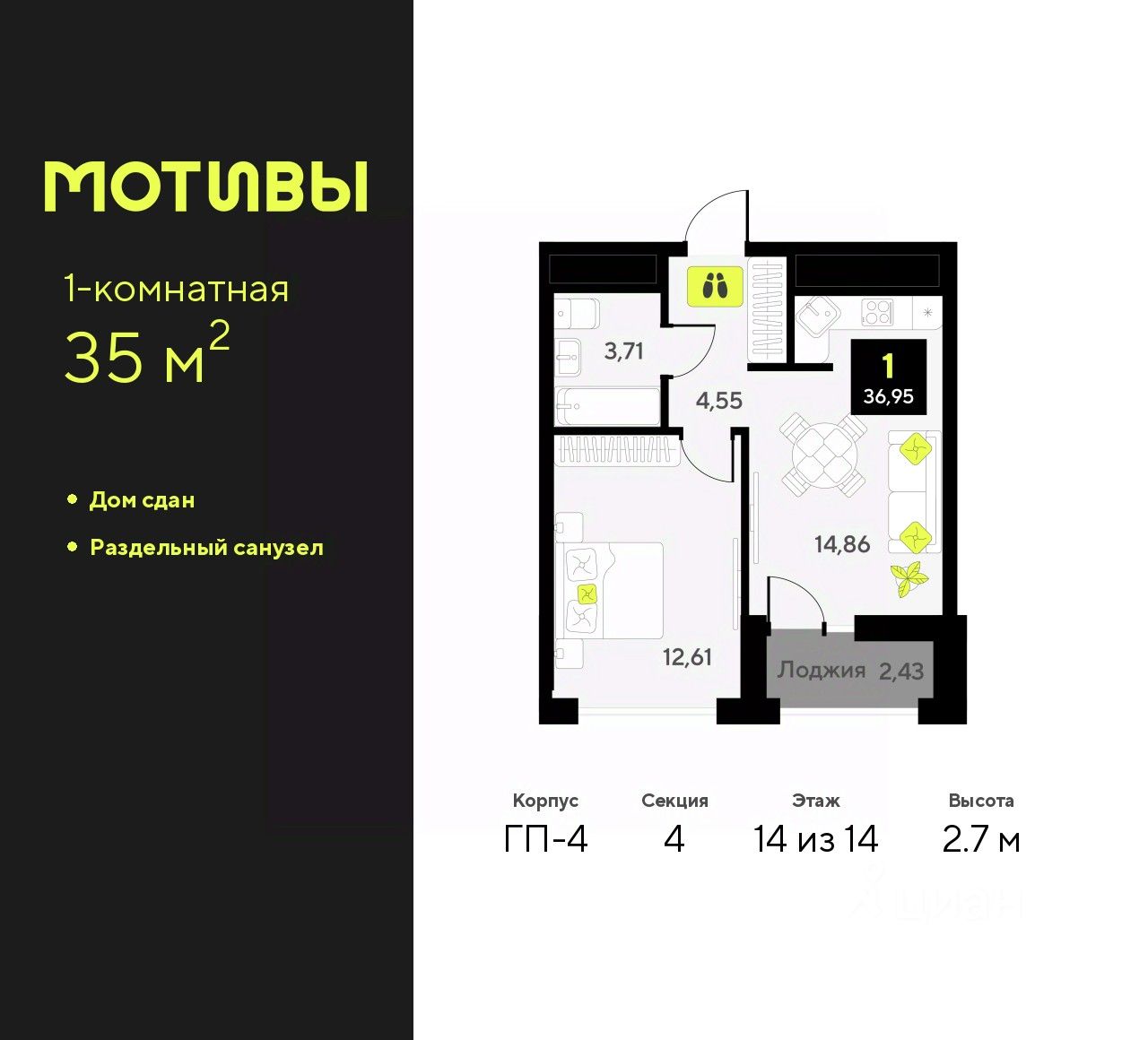 Просторная 1-комн. квартира в ЖК ''Мотивы'' на 14 этаже. Общая площадь: 35 кв.м. Высота потолков 2.7 м.