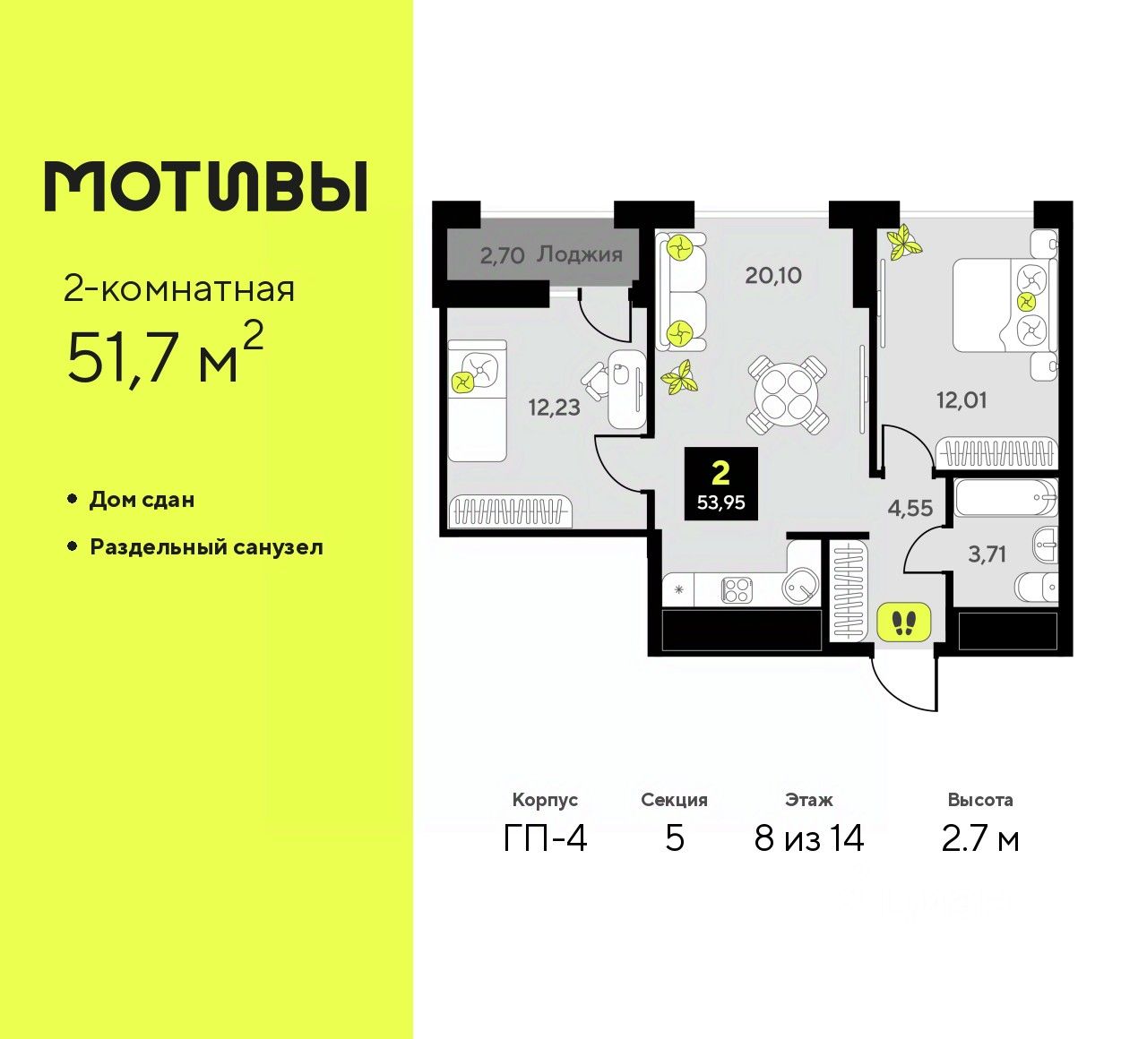 Общая площадь51,7 м2