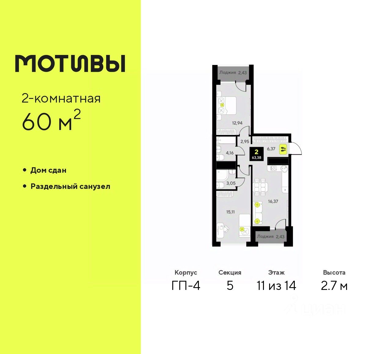 2-комн. квартира в ЖК ''Мотивы'' на 11 этаже. Общая площадь: 60 кв.м. Высота потолков 2.7 м.