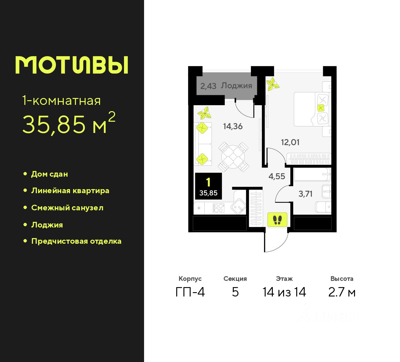 Дом монолитный, многоподъездный, переменной этажности, от 5 до 14 этажей. Квартира находится в 5-й секции высотой 14 этажей в корпусе ГП-4. На этаже 5 квартир. В подъезде 1 пассажирский и 1 грузовой лифт. В настоящее время строительство окончено, дом сдан в 4 квартале 2024 года. Оформление сделки по договору купли-продажи.