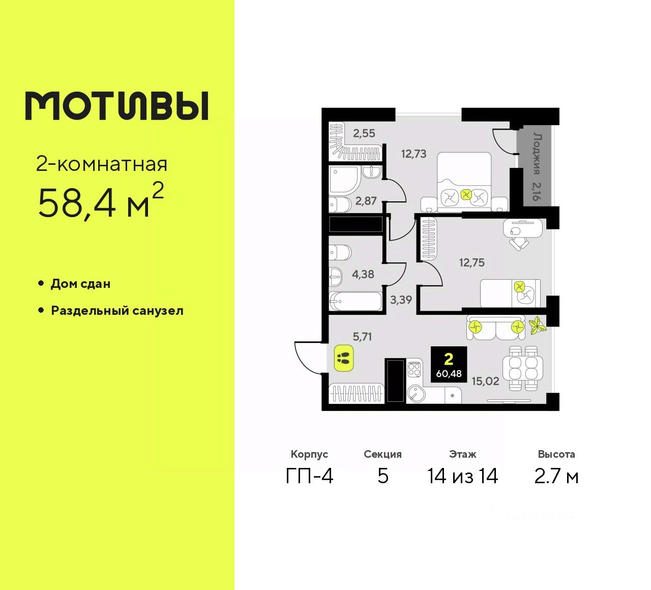 Двухкомнатная квартира в ЖК ''Мотивы'' на 14 этаже. Общая площадь: 58.4 кв.м. Высота потолков 2.7 м.