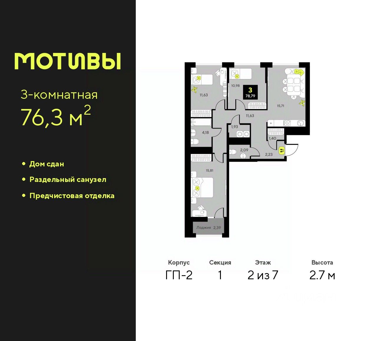 3-комн. квартира с предчистовой отделкой в ЖК ''Мотивы'' на 2 этаже. Общая площадь: 76.3 кв.м. Высота потолков 2.7 м.