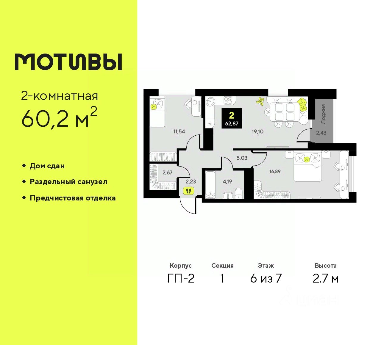 Двухкомнатная квартира с предчистовой отделкой в ЖК ''Мотивы'' на 6 этаже. Общая площадь: 60.2 кв.м. Высота потолков 2.7 м.