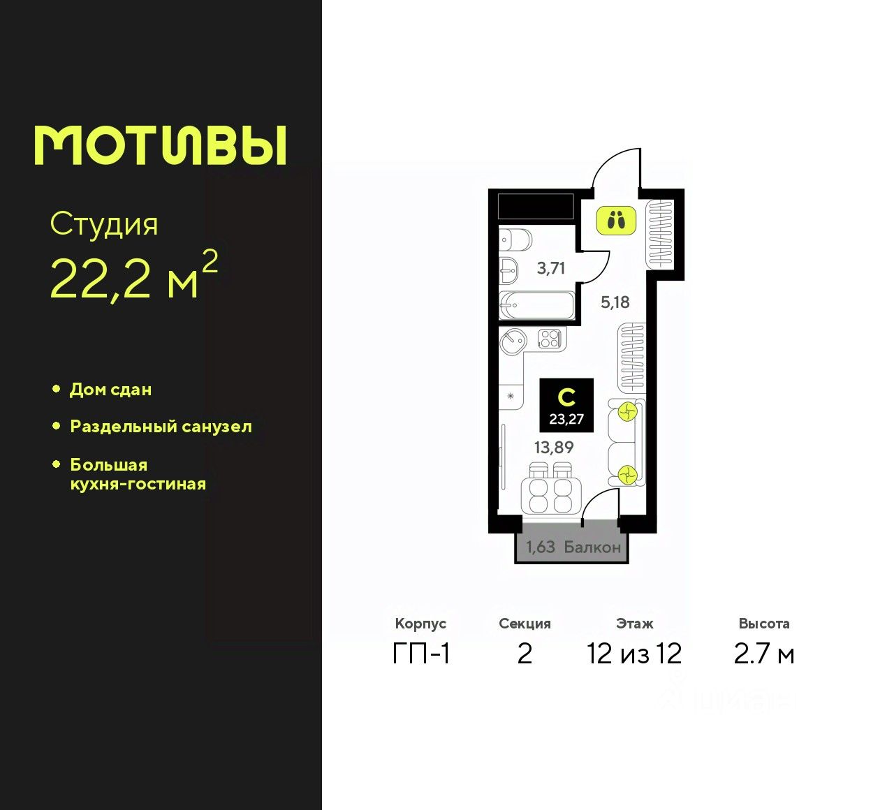 Общая площадь22,2 м2