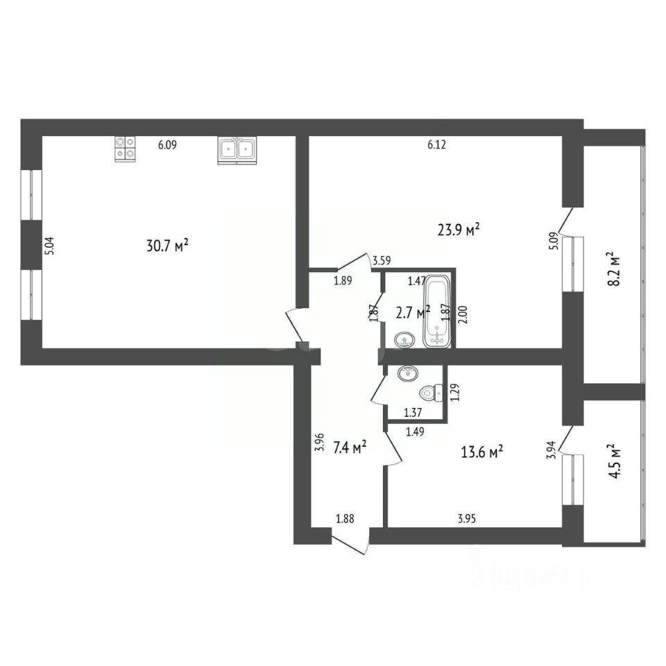 Есть огромная кухня-гостиная площадью 30,7 кв.м. и две изолированные спальни - 23,9 кв.м. и 13,6 кв.м. Из большой спальни есть выход на просторную лоджию - 8,2 кв.м. Санузел раздельный.