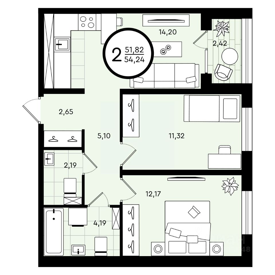 Общая площадь54,24 м2
