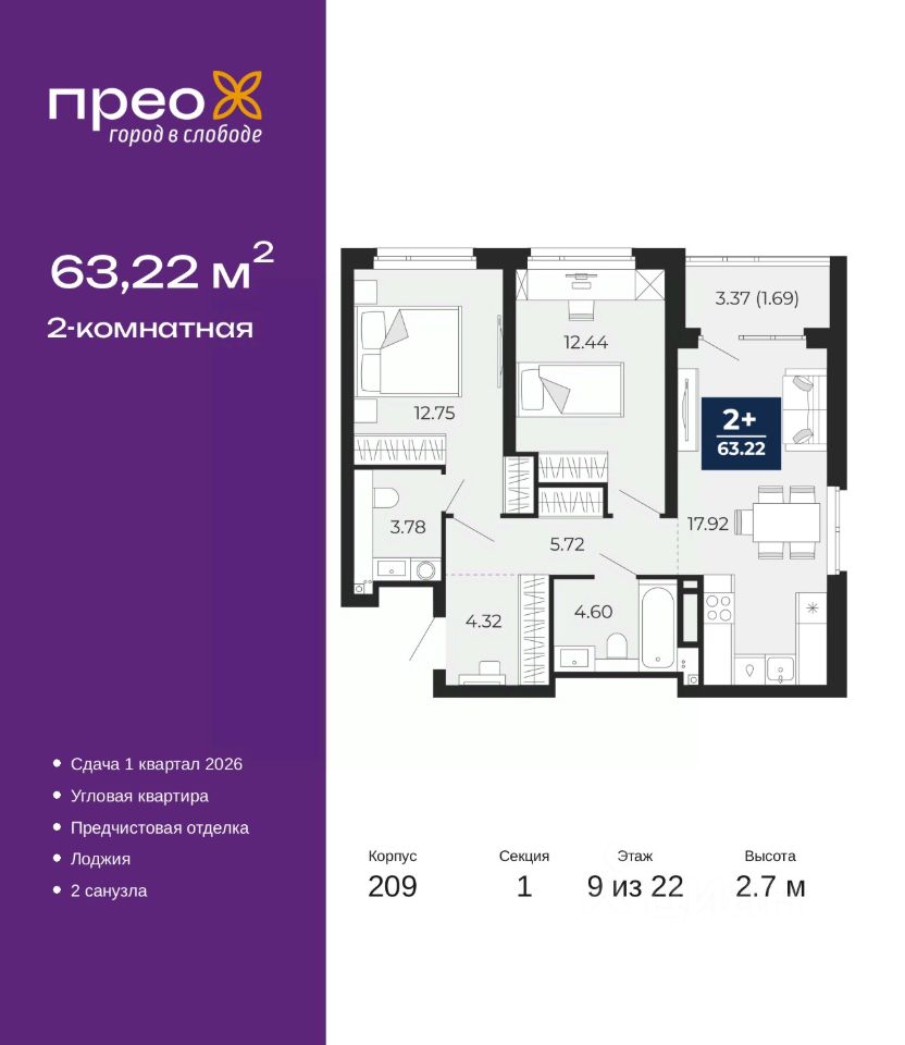 Просторная 2-комн. квартира с предчистовой отделкой в ЖК ''Прео'' на 9 этаже. Общая площадь: 63.22 кв.м., жилая: 25.19 кв.м., площадь просторной кухни-столовой: 17.92 кв.м. Угловая квартира, очень светлая, естественная вентиляция при открытии окон. В квартире одна лоджия, один совмещенный и один раздельный санузел. Высота потолков 2.7 м.