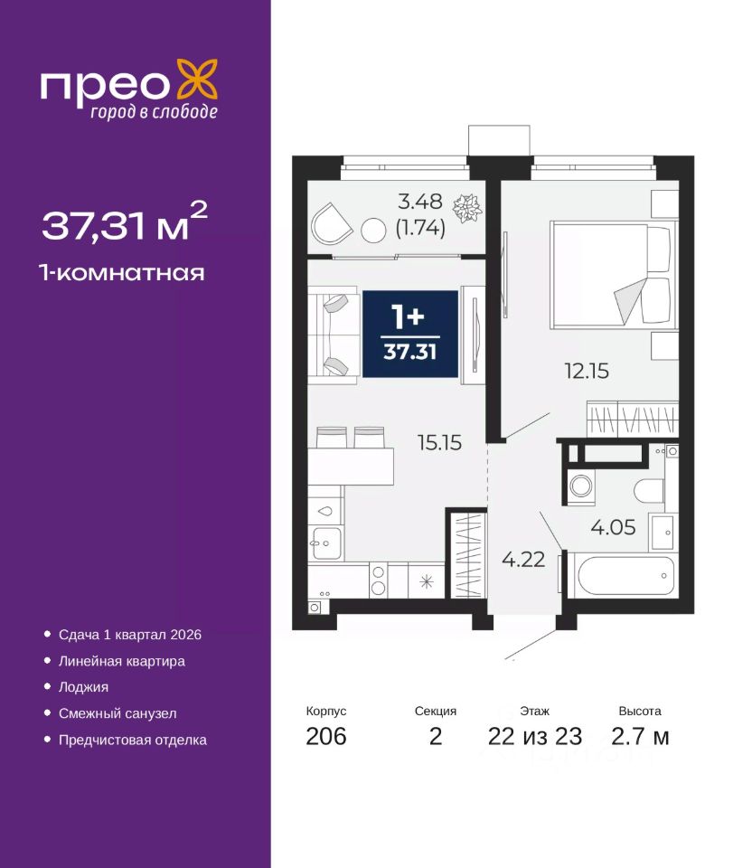 Просторная 1-комн. квартира с предчистовой отделкой в ЖК ''Прео'' на 22 этаже. Общая площадь: 37.31 кв.м., жилая: 12.15 кв.м., площадь просторной кухни-столовой: 15.15 кв.м. Все окна выходят на одну сторону. В квартире одна лоджия, один совмещенный санузел. Высота потолков 2.7 м.
