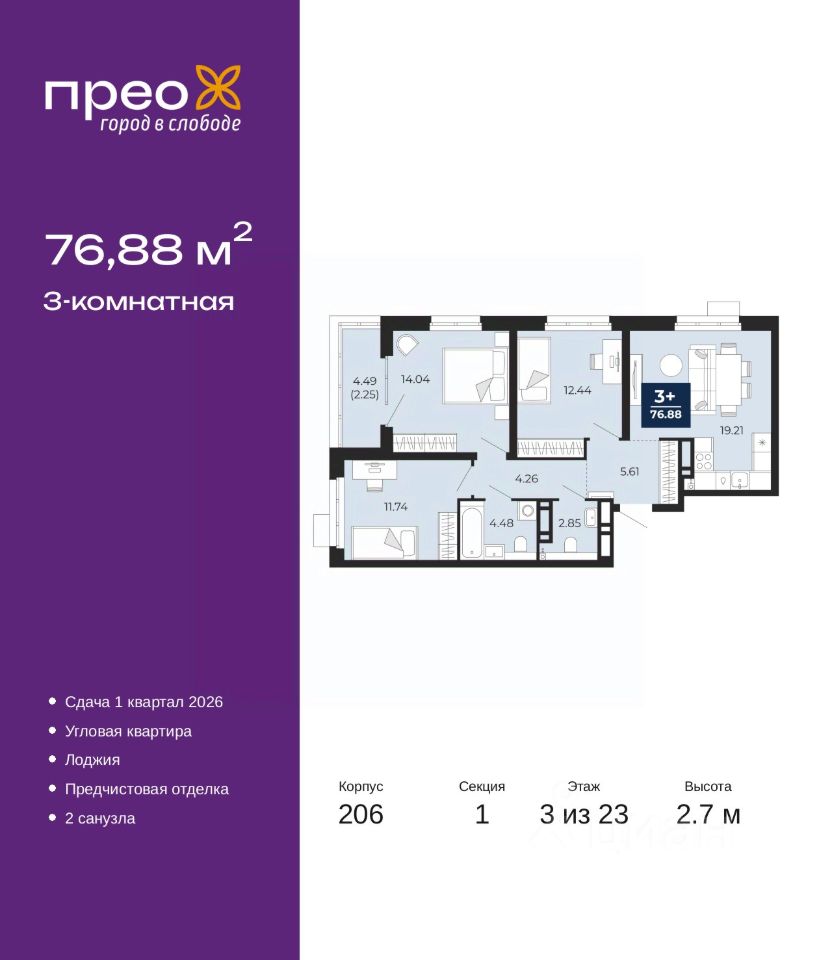 3-комн. квартира от застройщика с предчистовой отделкой в ЖК ''Прео'' на 3 этаже. Общая площадь: 76.88 кв.м., жилая: 38.22 кв.м., площадь просторной кухни-столовой: 19.21 кв.м. Угловая квартира, идеально подойдет любителям тишины и панорамных видов. В квартире одна лоджия, один совмещенный и один раздельный санузел. Высота потолков 2.7 м.