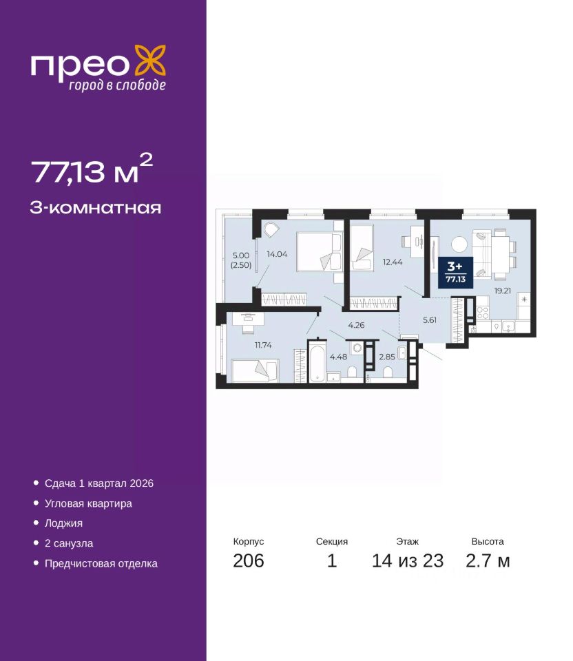 Просторная трехкомнатная квартира с предчистовой отделкой в ЖК ''Прео'' на 14 этаже. Общая площадь: 77.13 кв.м., жилая: 38.22 кв.м., площадь просторной кухни-столовой: 19.21 кв.м. Квартира угловая, идеально подойдет любителям тишины и панорамных видов. В квартире одна лоджия, один совмещенный и один раздельный санузел. Высота потолков 2.7 м.
