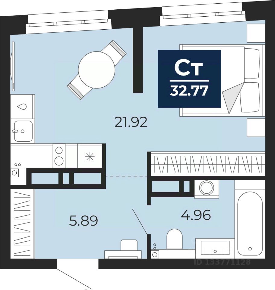 Просторная 1-комн. квартира-студия с предчистовой отделкой в ЖК ''Прео'' на 9 этаже. Общая площадь: 32.77 кв.м., площадь гостиной 21.92 кв.м., из которых 5 кв.м. выделено под кухонную зону. Все окна выходят на одну сторону. В квартире один совмещенный санузел. Высота потолков 2.7 м.
