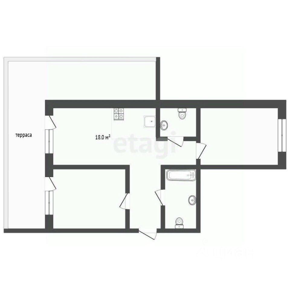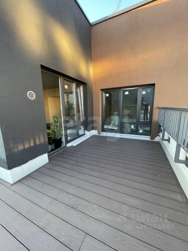 Планировка: распашонка (окна на две стороны дома), два санузла, кухня-гостиная и две спальни. Визитная карточка этой квартиры: просторная терраса с прекрасным видом.