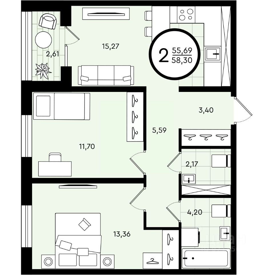 Общая площадь58,3 м2