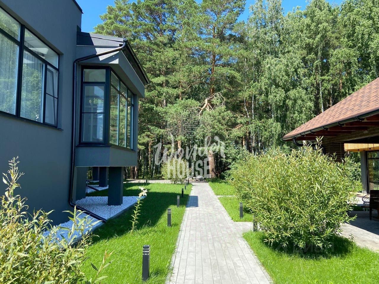 территория облагорожена, есть костровая и мангальная зона, выполнена подсветка деревьев и зонирование