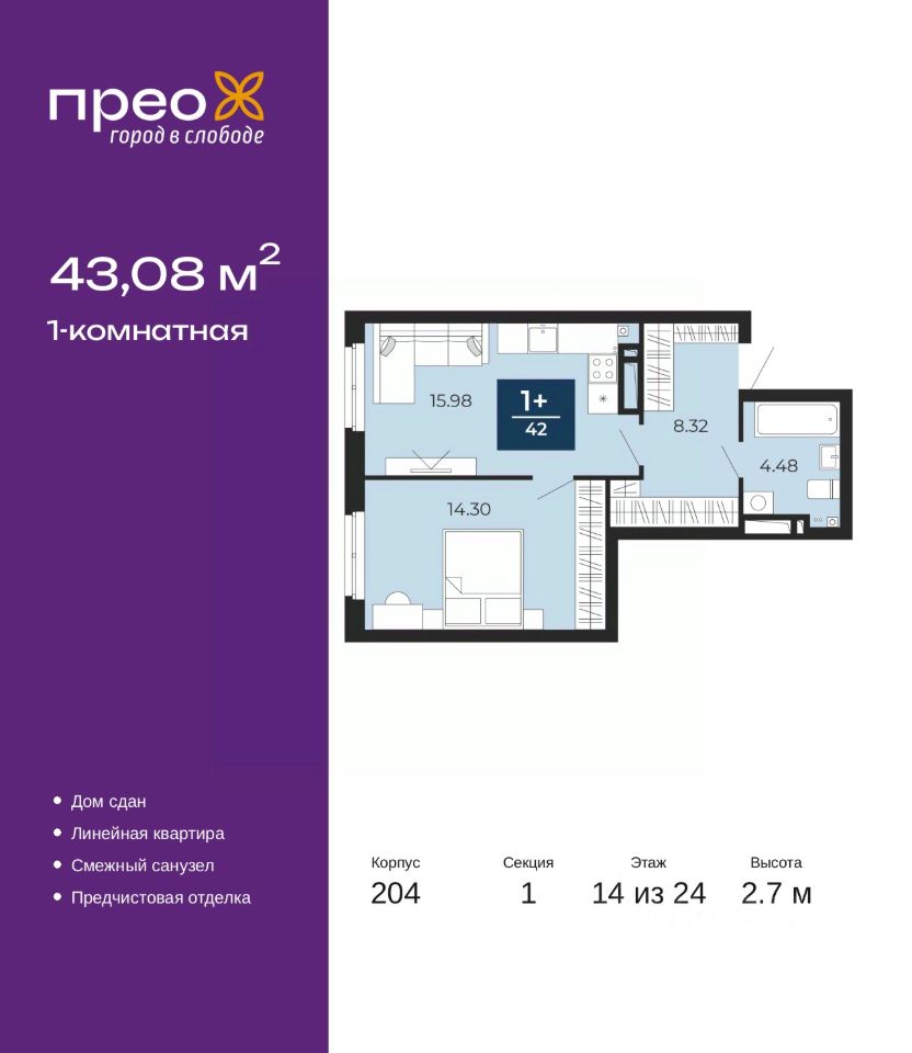Просторная однокомнатная квартира с предчистовой отделкой в ЖК ''Прео'' на 14 этаже. Общая площадь: 43.08 кв.м., жилая: 14 кв.м., площадь просторной кухни-столовой: 15.98 кв.м. Все окна выходят на одну сторону. В квартире один совмещенный санузел. Высота потолков 2.7 м.