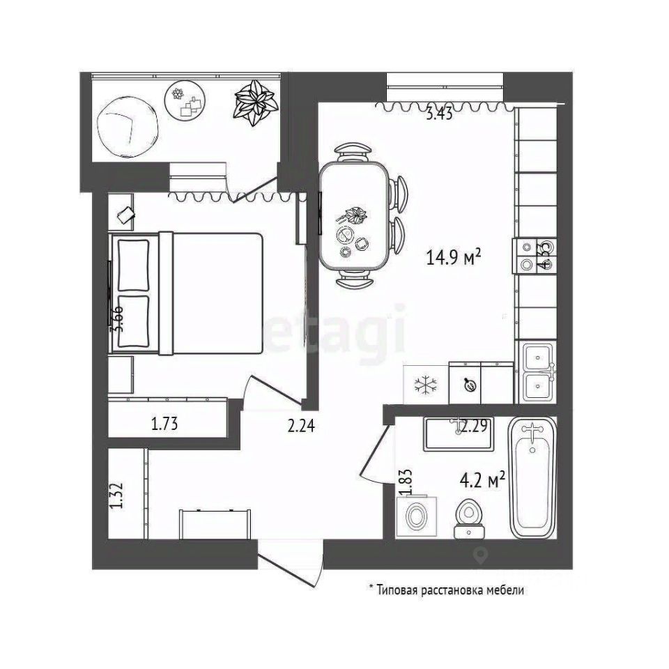 Улучшенная черновая отделка выровненные стены и стяжка пола, готова к ремонту мечты Функциональная планировка каждый метр с пользой. На планировке показан пример размещения мебели: просторная кухня-гостиная и уютная спальня, вместительный коридор, санузел и лоджия. Можно сразу приступать к отделке и создать интерьер под себя без переплаты за чужой вкус. О комплексе: