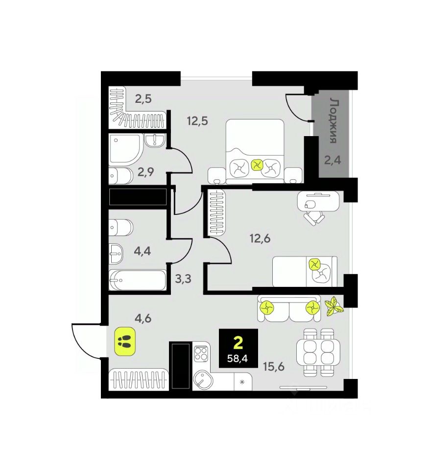 Общая площадь58,4 м2