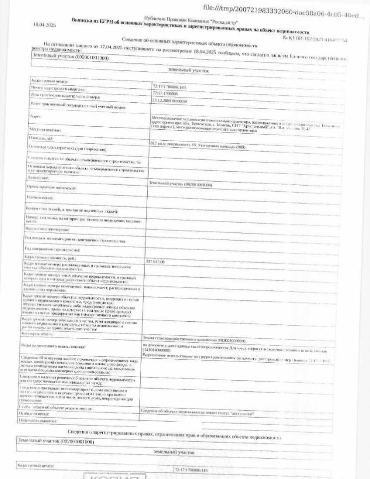 Должник: Сажина Е.Ю., собственник: Сажина Е.Ю. Лот: Земельный участок (земли сельскохозяйственного назначения, для садоводства и огородничества) на участке расположен жилой дом с синей крышей не введенный в эксплуатацию в установленном законом порядке, также на территории строительный мусор в виде досок и песка, площадь 817 кв.м., кадастровый номер:72:17:1706006:143, Местоположение установлено относительно ориентира, расположенного за пределами участка. Почтовый адрес ориентира: г. Тюмень, СНТ ''Хрустальный'', ул. 10-я, участок 42, н/ц: 1217370 р., з-к: 182606 р., код: 0001, рег. 72-010537-ГМУ,