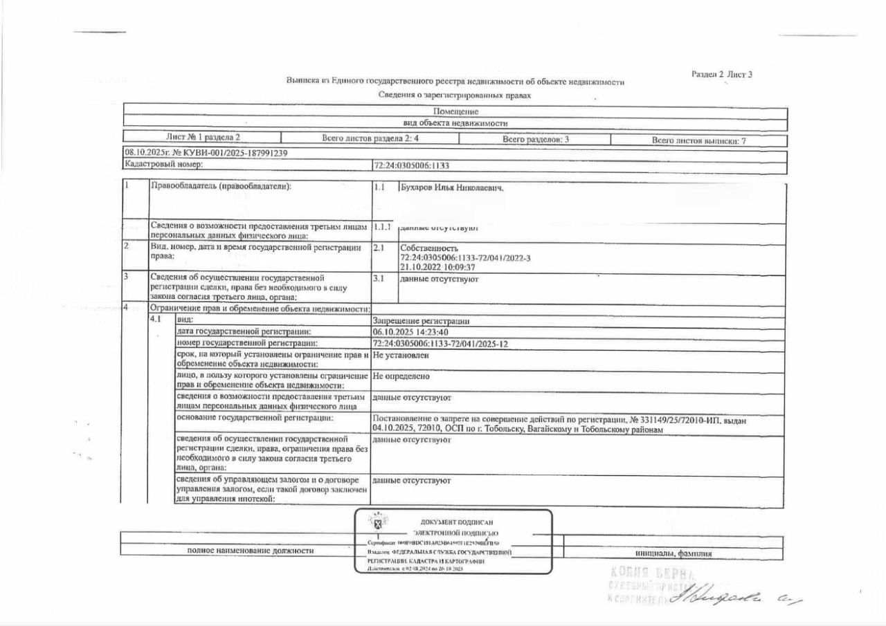 Должник: Бухаров И.Н., собственник: Бухаров И.Н. Лот: Жилое помещение (квартира), площадь 43,9 кв.м., кадастровый номер: 72:24:0305006:1133, г. Тобольск, пер. Рощинский, д. 60, кв. 23 (зарегистрировано 2-взрослых, 2-ребенка, задолженность по капитальному ремонту на 13.10.2025 составляет -10 т.р),н/ц: 1342718,82 р., з-к: 1342 р, код: 0014, рег. 72-0105-66,