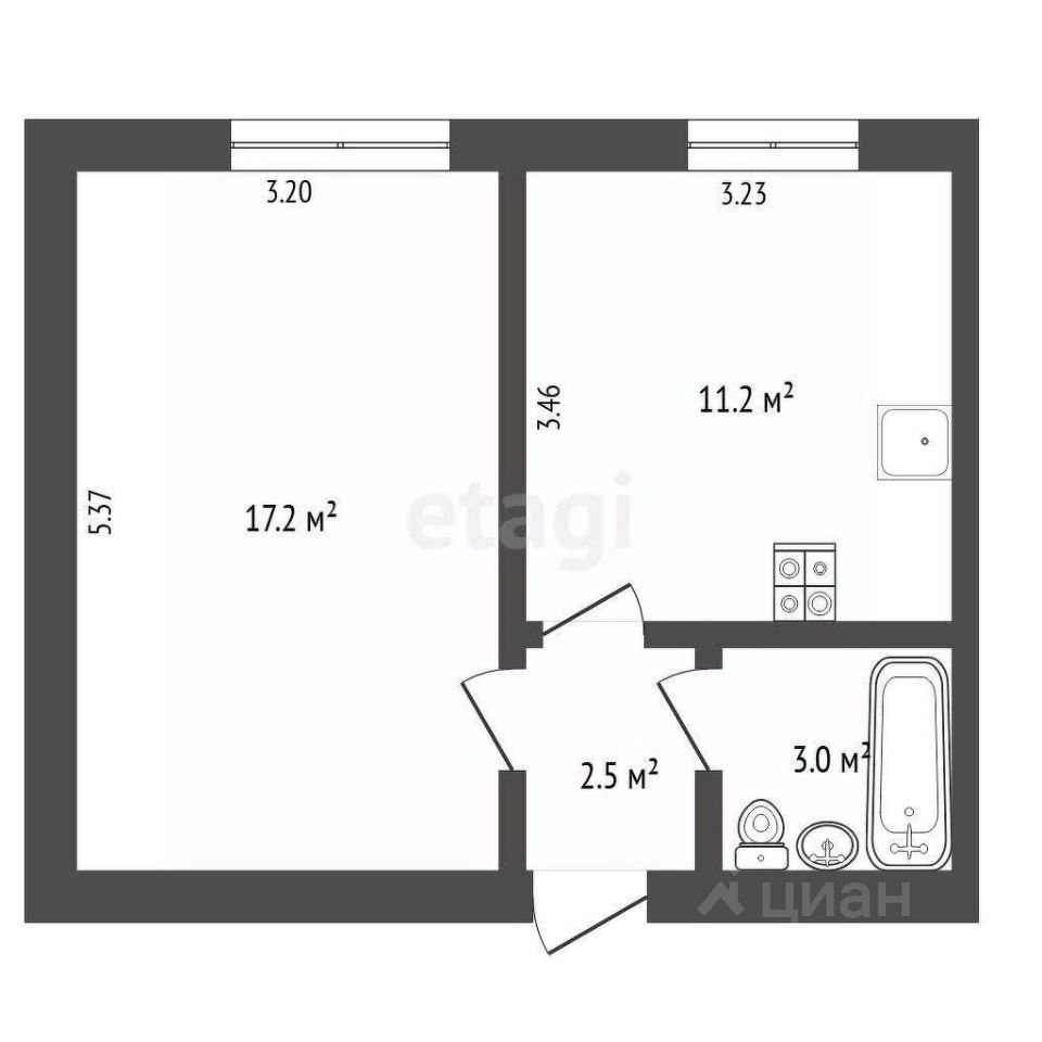 В квартире спальня правильной формы площадью 17,2 м² и кухня площадью 11,2 м². Установлены пластиковые окна,что делает квартиру еще более теплой. Санузел совмещённый, с ремонтом в спокойных тонах, площадью 3 м².